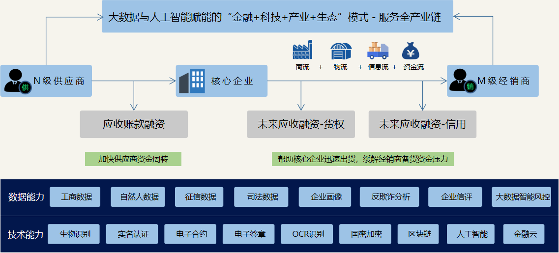 依托區(qū)塊鏈、大數(shù)據(jù)、人工智能等技術(shù),核心企業(yè)基于自身對上下游的真實貿(mào)易背景, 實現(xiàn)信用多級可信流轉(zhuǎn);實現(xiàn)四流合一,保證底層資產(chǎn)真實性、有效性、完整性, 風(fēng)險可控,降低融資成本,全線上化融資。